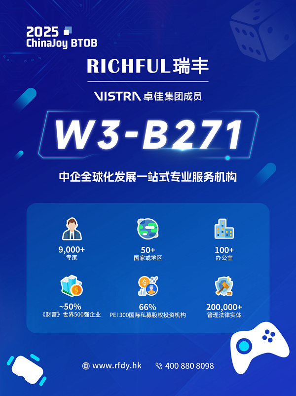 ChinaJoy作為中國乃至全球數字娛樂產業的風向標,是連接國內外游戲企業、探索合作機遇的頂級平臺。RICHFUL瑞豐深刻理解中國游戲企業在“走出去”過程中面臨的合規、財稅、運營、架構搭建等復雜挑戰。我們參展ChinaJoy BTOB,正是為了深度參與這場游戲盛會,與優秀的中國游戲開發者、發行商、平臺方和投資機構面對面交流,分享我們在支持企業全球化方面的專業經驗,特別是針對游戲出海的關鍵環節。
