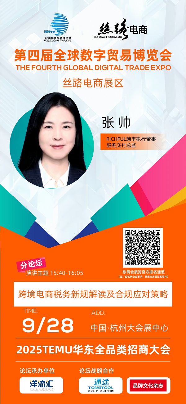 展會期間(9月28日),RICHFUL瑞豐執(zhí)行董事、服務交付總監(jiān)張帥女士將出席2025TEMU華東全品類招商大會,發(fā)表《電商新規(guī)解讀及跨境電商稅務全球稅務考量》重磅演講。屆時將權(quán)威解讀2025年15號、17號公告最新政策,深入剖析四大合規(guī)模式的適用場景與落地策略,幫助企業(yè)應對全鏈條穿透式監(jiān)管新挑戰(zhàn)。