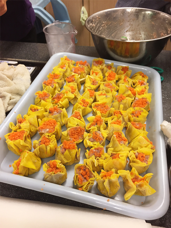 瑞豐義工團都馬上動手,聽從導師指示分工,先包燒賣和臘腸卷。