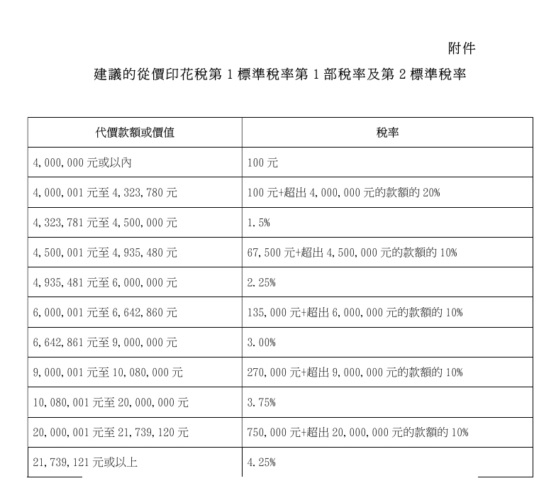 買賣或轉讓住宅或非住宅物業的文書須按物業售價或價值(以較高者為準)繳付從價印花稅。最低的從價印花稅稅率為一百元,適用于售價或價值為三百萬元或以下的物業。經調整后,售價或價值為四百萬元或以下的物業須繳的從價印花稅一律為一百元。計及特別寬減后,預計調整將惠及約百分之十五的物業成交個案,政府收入每年減少約四億元。調整后的稅階見附件。新稅階適用于二零二五年二月二十六日或之后簽立的文書。