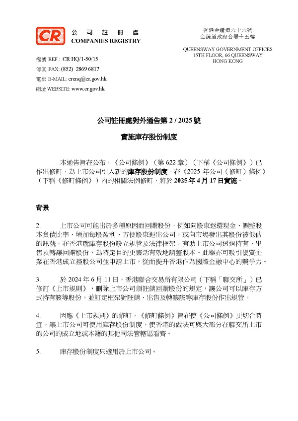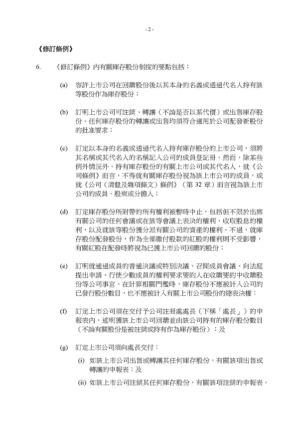 《公司條例》(第622章)已作出修訂,為上市公司引入新的庫存股份制度,讓上市公司可以庫存方式持有和處置回購的股份。在《2…