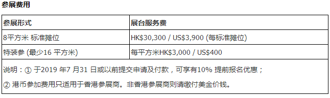 說明:港幣展臺服務費只適用于持有效香商業登記證的香港參展商,其他機構必須以美金展臺服務費付款。