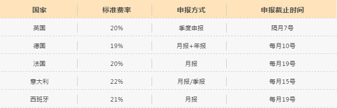 以英國為例,除了零稅率外,還包含一般稅率和低稅率。絕大多數賣家銷售的商品都是一般稅率,它的標準費率為20%,而對于年銷售額小于15萬英鎊的賣家則可以申請低稅率,首年內可享受6.5%固定稅率,次年可享受到7.5%固定稅率。各國的稅率、申報方式與時間節點都略有不同,以下圖表是各國VAT標準費率與申報時間。